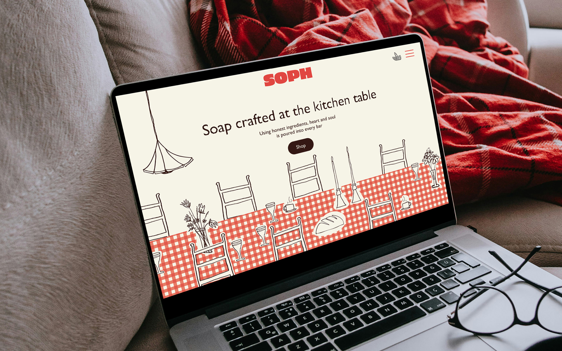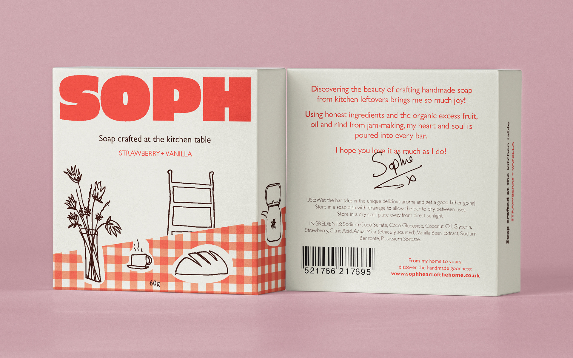A visual approach developed, embracing the wholesome, relaxed nature of both Sophie - producing soap at her kitchen table - and the target customer - enjoying the heartier pleasures in life. Soap crafted at the kitchen table, at the heart of the home, became the driving force for the brand. From the informal shortening of Sophie’s name for the brand, to the full and plump typeface, the logo oozes personal, homely charm - a big cuddle from mum in the kitchen. Hand drawn illustrations, using a simple line, invite you to unwind, relax and soak up the warm embrace of a deliciously smelling homemade lather.